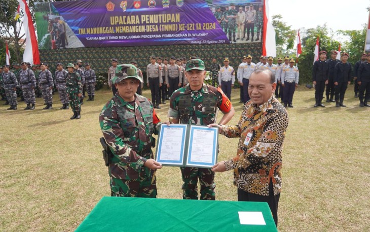 Penutupan ditandai dengan diserahterimakannya hasil TMMD dari Komandan Kodim 0736/Batang Letkol Inf Ahmad Alam Budiman, S.E., M.I.Pol., M.Han kepada Pejabat (Pj) Bupati yang diwakili oleh Pj. Sekda Kab. Batang Ari Yudianto dan disaksikan oleh Pangdam IV/Diponegoro Mayor Jenderal TNI Deddy Suryadi, S.I.P., M.Si., Komandan Korem 071/Wijayakusuma Kolonel Inf Jamaluddin, S.I.P, beserta segenap jajaran Forkopimda Batang.