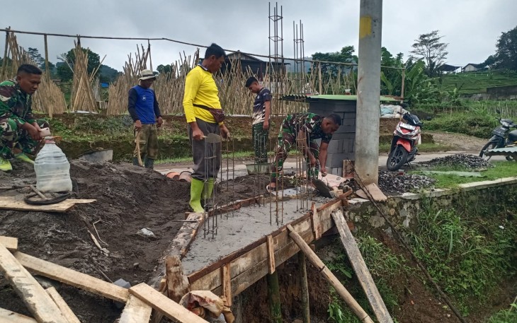 Dalam kegiatan itu, anggota Satgas TMMD Koptu Fredy bersama warga, termasuk Mbah Joyo (68), terlihat bekerja dengan penuh ketelitian di lokasi pembangunan. Mereka menyiapkan adukan semen, merapikan cetakan beton, serta memperkuat rangka besi yang menjadi struktur dasar prasasti. Meskipun cuaca mendung menyelimuti kawasan Bandardawung, semangat kerja tetap terjaga dengan baik.